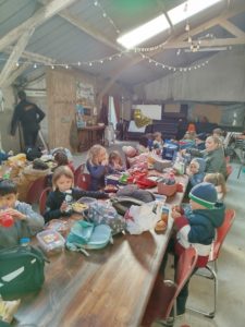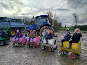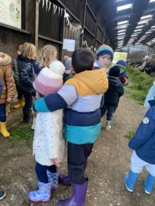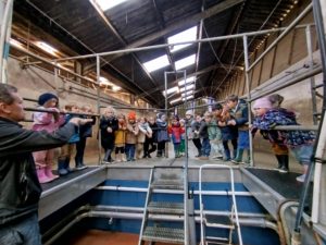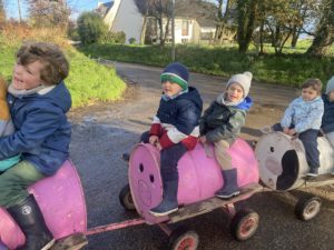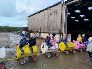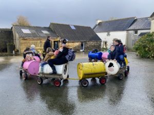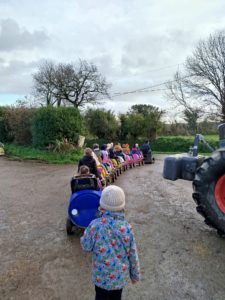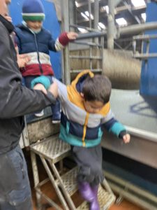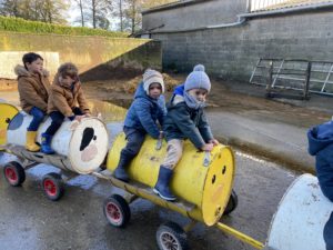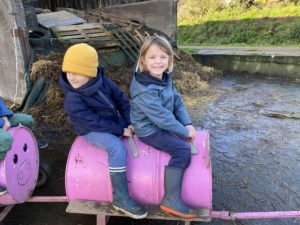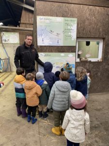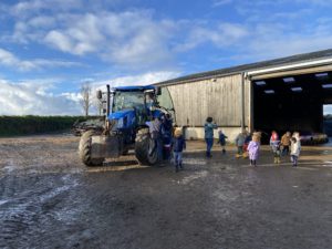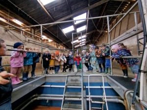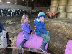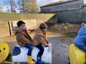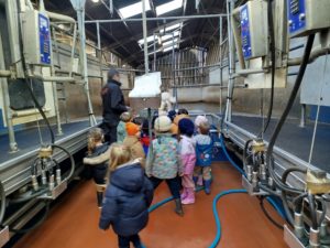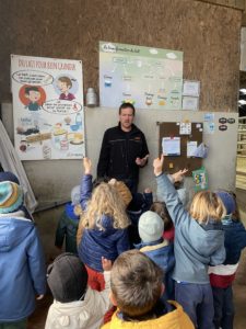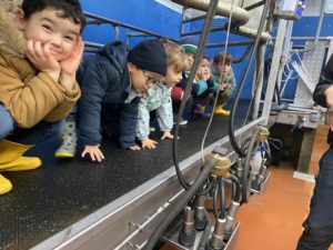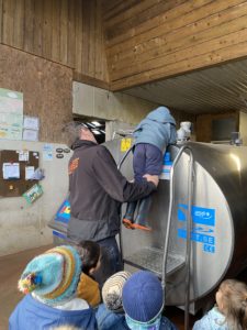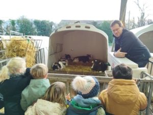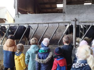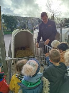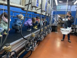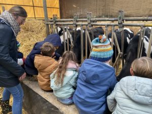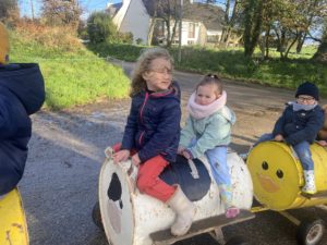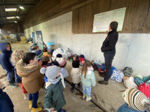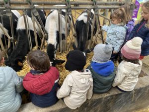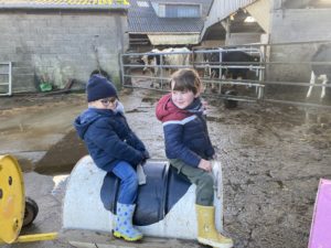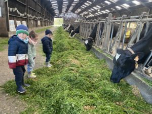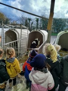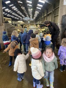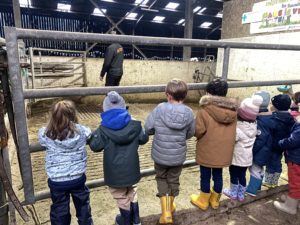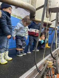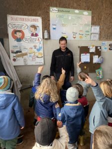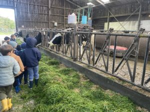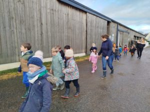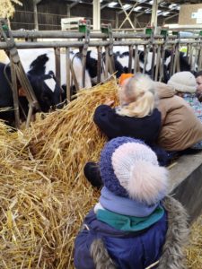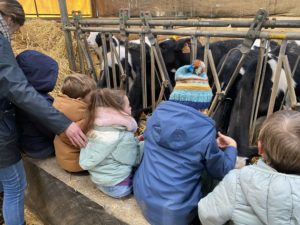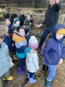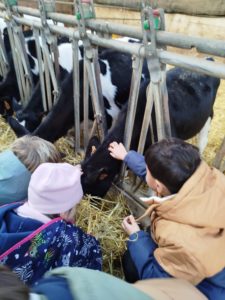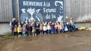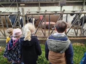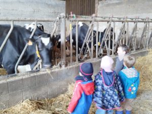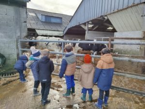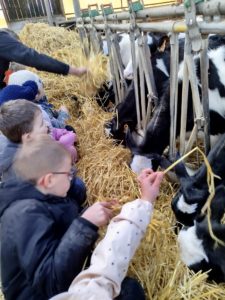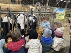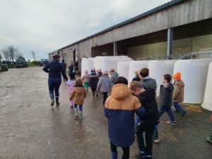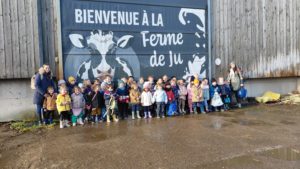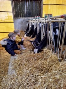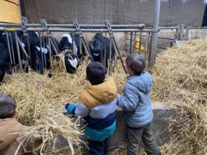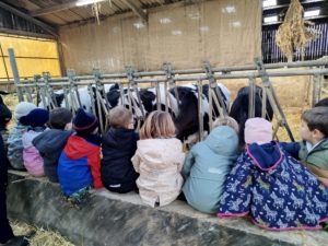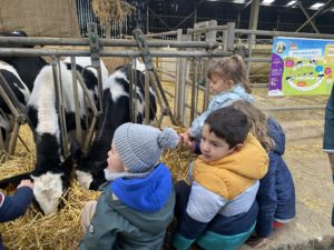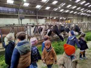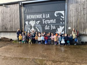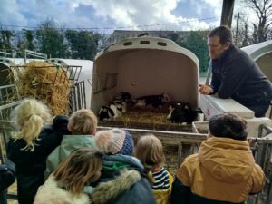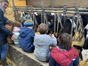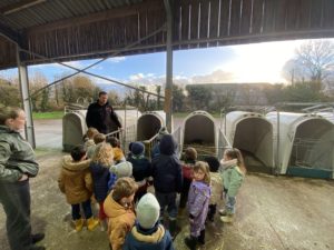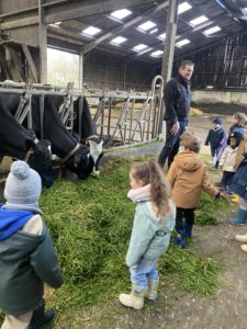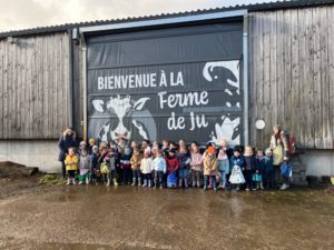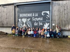 Ce mardi, les classes de PS/MS et de GS/CP ont passé la journée à la ferme de Julien à Plouzané. Les élèves ont découvert les veaux, les vaches et les génisses, et ont visité l’étable et la salle de traite. Julien leur a expliqué la vie des animaux, leur nourriture et le fonctionnement de la ferme.
